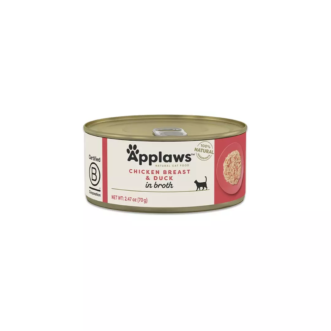 Applaws Chicken Breast with Duck keitinliemessä on gluteeniton ja sokeriton purkkiruoka, joka on tarkoitettu aikuisille kissoille.
