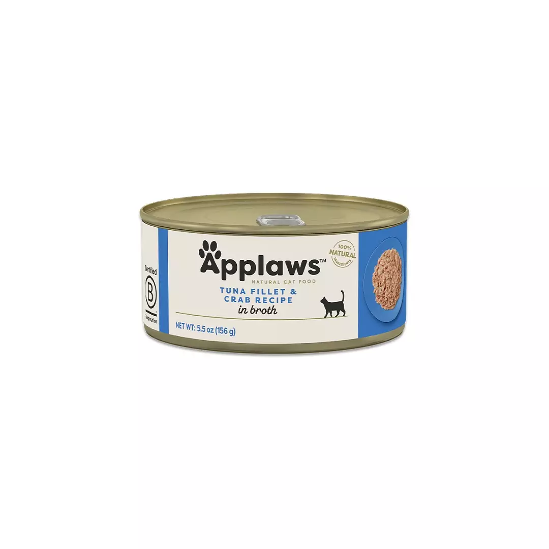 Applaws Tuna Fillet with Crab keitinliemessä on gluteeniton ja sokeriton purkkiruoka, joka on tarkoitettu aikuisille kissoille.