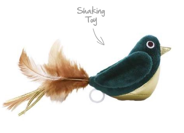 Pehmeä ja värikäs lintu värisee ja liikkuu "narumoottorin" avulla. Vedä naru ulos linnusta ja narun palautuessa lintu tärisee ja värisee sekä liikkuu kissaa houkuttelevasti. Pehmeä plyysilelu on kevyt kantaa ja pyrstön sulat houkuttaa kissasi pitkään leikkituokioon. Takuuvarmaa viihdettä kaikille kissoille.