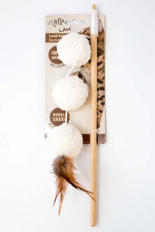 Hauska All For Paws -kissanonki "Lammaskebab" herättää varmasti kissasi mielenkiinnon! Kissanminttua sisältävät karvapallot pitävät hauskaa helisevää ääntä ja viimeisessä pallossa on vielä höyheniä houkuttimena. Kestävä puuvarsi ja nylonnaru.