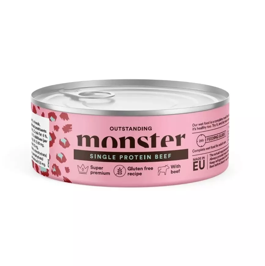 Monster Single Protein Nauta kissan märkäruoka on valmistettu puhtaasta naudanlihasta, joka on ruoan ainoa proteiininlähde. Se tarjoaa kissallesi juuri sitä mitä se luonnollisesti kaipaa – runsaasti lihaa ja ravintoaineita. Gluteeniton koostumus sopii erinomaisesti myös herkkävatsaisille kissoille.