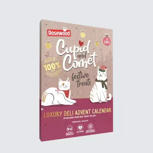 Rosewood kissojen joulukalenterissa on jokaiselle päivälle pieni herkkuyllätys, joka saa kissan viikset värisemään. Jokaisen luukun takaa löytyy pakastekuivattua ankka- ja kanaherkkuja, josta harva kissa kieltäytyy.