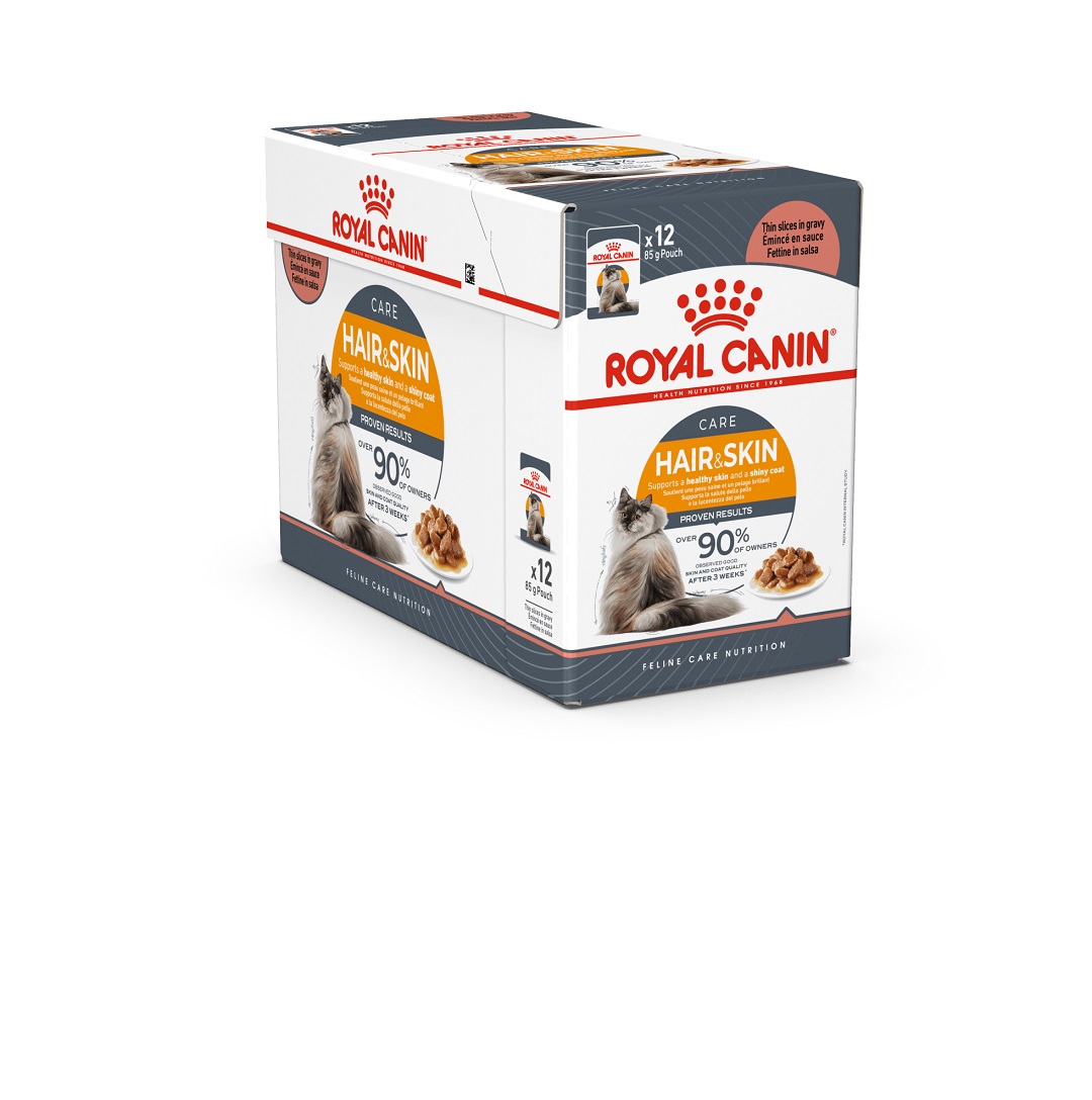 Royal Canin Hair & Skin -säilyke on tarkoitettu tukemaan aikuisten, 1-7-vuotiaiden, kissojen ihon ja turkin hyvinvointia. Märkäruoka on täysravintoa ja se sisältää ohuita suikaleita maistuvassa kastikkeessa.