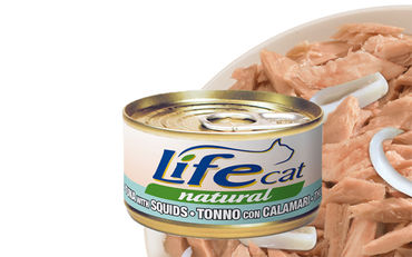 LifeCat tonnikala ja kalmari sisältää runsaasti herkullista tonnikalaa hiutaleina, maukkaalla kalmarilla höystettynä. Tonnikalassa on runsaasti proteiinia ja se on erinomainen lähde välttämättömille omega 3 rasvahapoille, niinkuin myös mineraaleille ja vitamiineille. Kalmarista tulee ruokaa houkutteleva tuoksu, LifeCat kissanruoat sopivat osaksi kissan täysipainotteista ruokavaliota esimerkiksi raksujen lisänä. LifeCat kissanruoka on vähemmän prosessoitua ja purkin sisällöstö tunnistaa katsomalla, mitä raaka-aineita se sisältää.