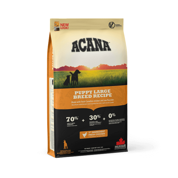 Acana Dog Puppy Large Breed on viljaton täysravinto suurikokoisten koirarotujen pennuille, joiden aikuispaino tulee olemaan yli 25 kg.