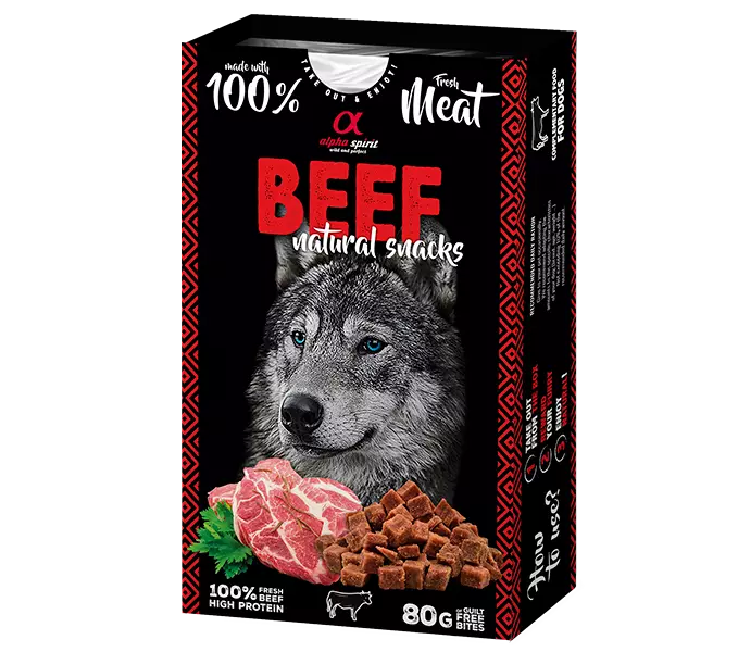 Alpha Spirit Naturals sarjan makuipalat ovat luonnollisia, puolikosteita treeninameja. Alpha Spirit Naturals Beef makupaloissa maistuu herkullinen tuore naudanliha.