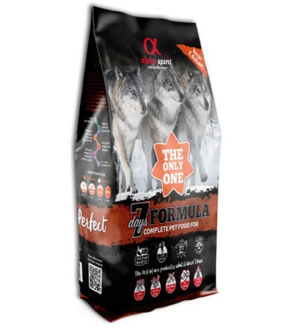 Alpha Spirit The Only One 7 Days aikuisen koiran täysravinto sisältää runsaasti lihaa eikä lainkaan viljaa.