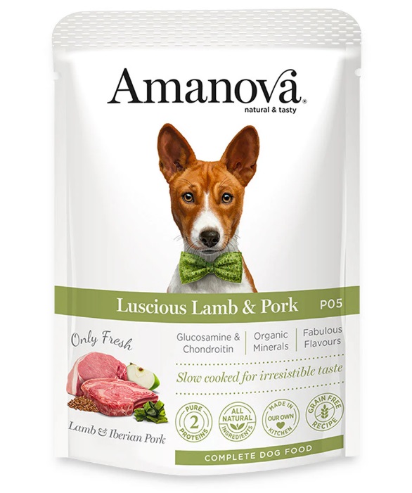Tuoreesta naudan ja lampaanlihasta ja kasviksista valmistettu Amanova Adult Lucious Lamb & Pork on herkullinen märkäruoka kaikille koirille.