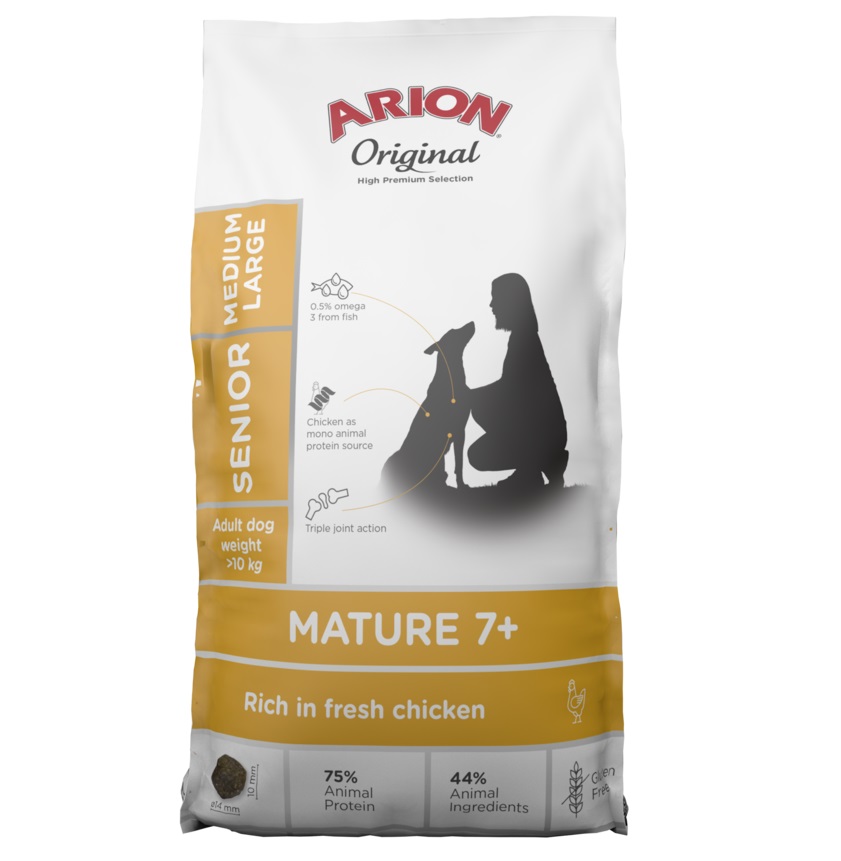 Arion Mature vanhan koiran ruoka sisältää hyvin sulavaa kanaa sekä prebiootteja, jotka tukevat ruoansulatusta ja vahvistavat suoliston hyödyllisiä bakteereja. Omega-3 -rasvahapot ja sinkki auttavat ylläpitämään ihon ja turkin terveyttä. Sinkin tarve kasvaa vanhoilla koirilla ja erityisesti karvanvaihdon aikana.