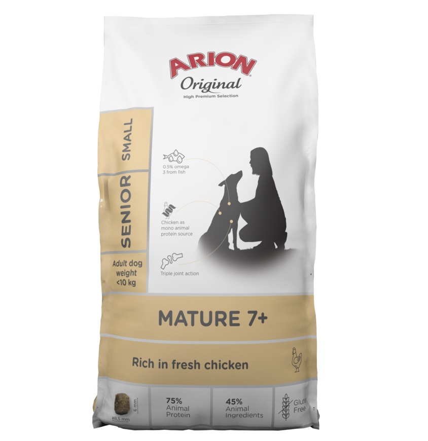 Arion mature 7+ small on kanaa sisältävä täysravinto, joka on suunniteltu pienikokoisille, ikääntyville koirille, joiden aikuispaino on alle 10 kg.