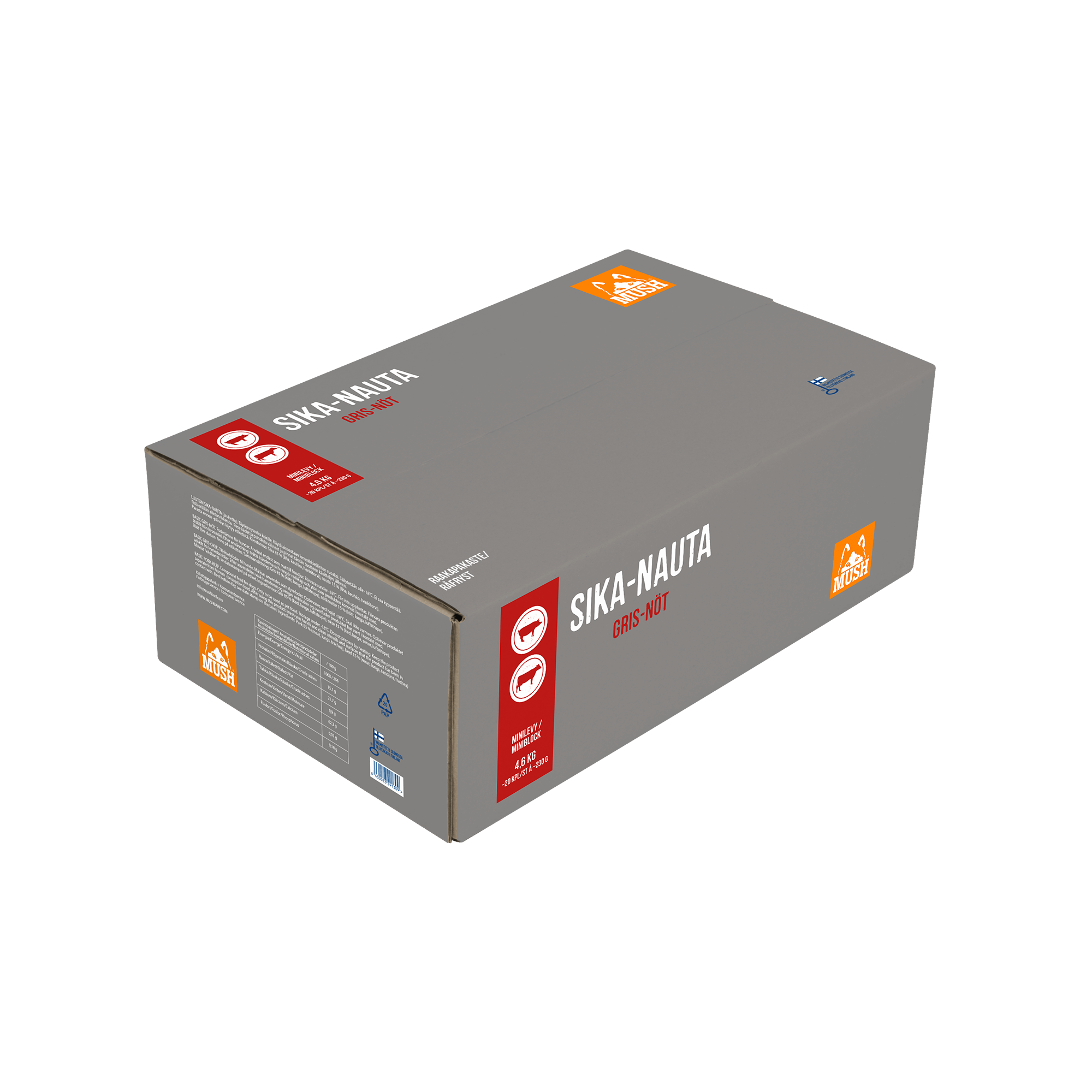 Mush Basic Sika-nauta jauheliha, 4,6 kg laatikko sisältää 20 kpl n. 230 g levyjä.