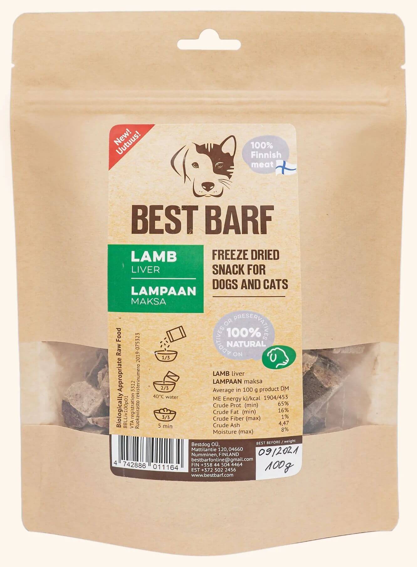 Best Barf pakastekuivattu lampaan maksa on maistuva herkku treeninamiksi tai ihan vain jälkiruuaksi! Herkulliset maksakuutiot sopivat hyvin myös välipalaksi, lisäämään ruuan monipuolisuutta tai esimerkiksi nirsolle koiralle lisukkeeksi muun ruuan joukkoon lisämakua tuomaan. Pakastekuivattuja kuutioita voi murustaa juomaveden sekaan jos vesi ei meinaa maistua esimerkiksi kesähelteillä. Valmistettu kotimaisesta lampaan maksasta eikä sisällä lisättyjä maku-, lisä- tai säilöntäaineita. 100 g pakastekuivattua tuotetta sisältää noin 400 g raakaa lampaan maksaa, josta on poistettu vesi; pakastekuivaus säilyttää raa'an lihan maun ja ravintoarvot.