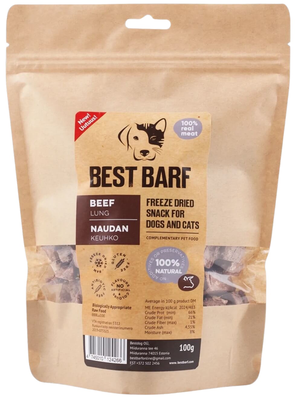 Best Barf pakastekuivattu naudan keuhko on maistuva herkku treeninamiksi tai ihan vain jälkiruuaksi! Herkulliset keuhkokuutiot sopivat hyvin myös välipalaksi, lisäämään ruuan monipuolisuutta tai esimerkiksi nirsolle koiralle lisukkeeksi muun ruuan joukkoon lisämakua tuomaan. Pakastekuivattuja kuutioita voi murustaa juomaveden sekaan jos vesi ei meinaa maistua esimerkiksi kesähelteillä. Valmistettu naudan keuhkosta eikä sisällä lisättyjä maku-, lisä- tai säilöntäaineita. 100 g pakastekuivattua tuotetta sisältää noin 400 g raakaa naudan keuhkoa, josta on poistettu vesi; pakastekuivaus säilyttää raa'an lihan maun ja ravintoarvot.