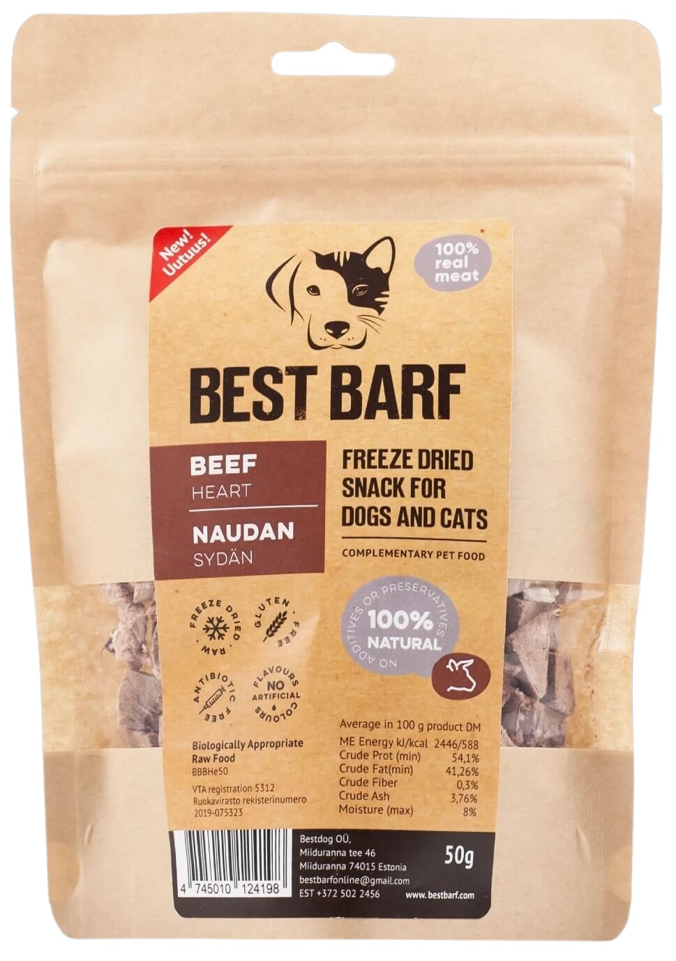 Best Barf pakastekuivattu naudan sydän koirille ja kissoille sekä muille lihansyöjille.