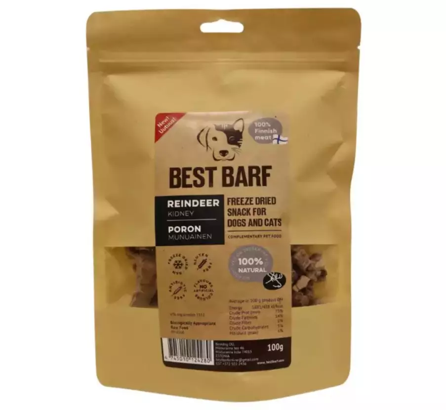Best Barf pakastekuivattua poron munuaista voidaan käyttää makupaloina koulutukseen tai antaa sellaisenaan jälkiruokana tai muun ruoan lisukkeena. Pakastekuivaus säilyttää raa'an munuaisen lihaisan maun ja rikkaat ravintoarvot.
