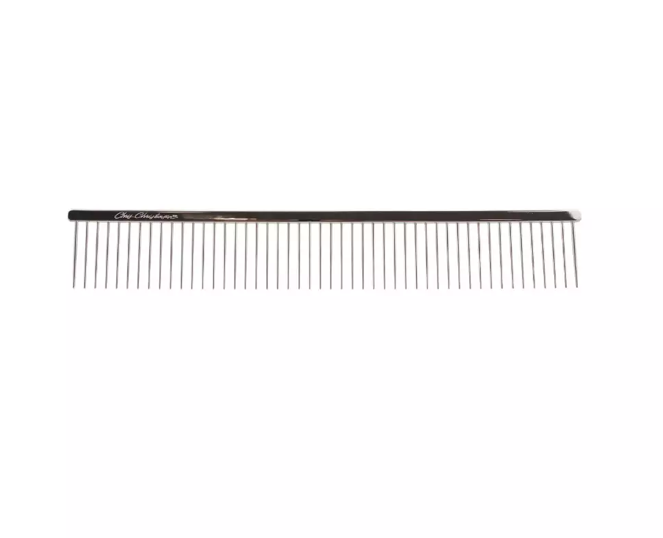 Chris Christensenin Poodle Buttercomb metallikammassa on vankka messinkirunko ja ruostumattomat teräspiikit, jotka kestävät vuosia ilman vääntymistä tai kulumista. Villakoirakamman piikit ovat pyöristetyt ja hiottu täydellisiksi, jolloin ne liukuvat turkissa vaivattomasti ilman nykimistä tai karvat katkeilua.