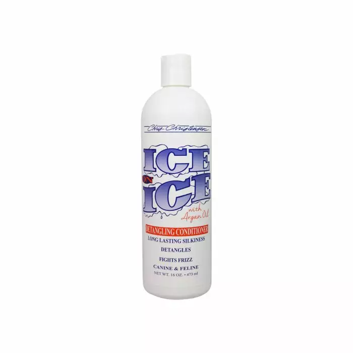 Chris Christensen Ice on Ice Detangling Conditionerin vähentää takkuisuutta ja kosteuttaa turkkia jättäen sen pehmeäksi ja kiiltäväksi.
