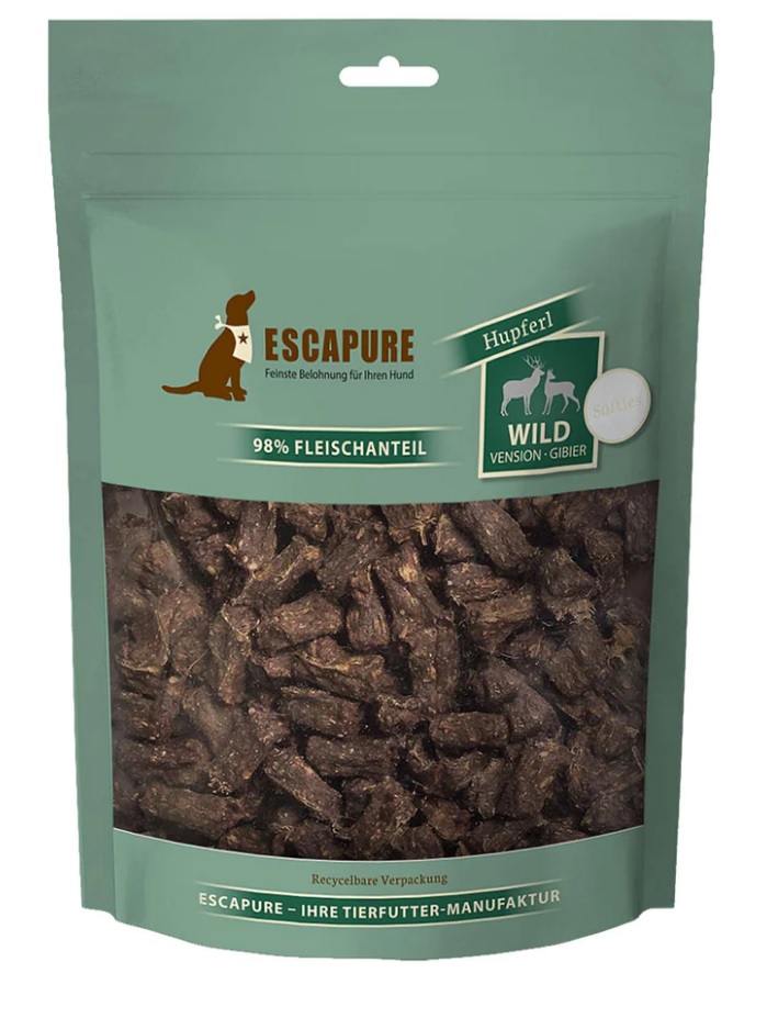 Escapure Soft riistalihapala on pehmeä, pieni lihaherkku koulutusmakupalaksi ja kaikkeen herkutteluun. Pelkästä saksanhirvestä valmistettu herkkupala sopii erityisesti herkemmille yksilöille. Riistan lihassa on yleensä voimakas ja houkutteleva tuoksu. Lihapalan koko on noin 1,5 cm x 0,6 cm ja palan saa helposti puolitettua.
