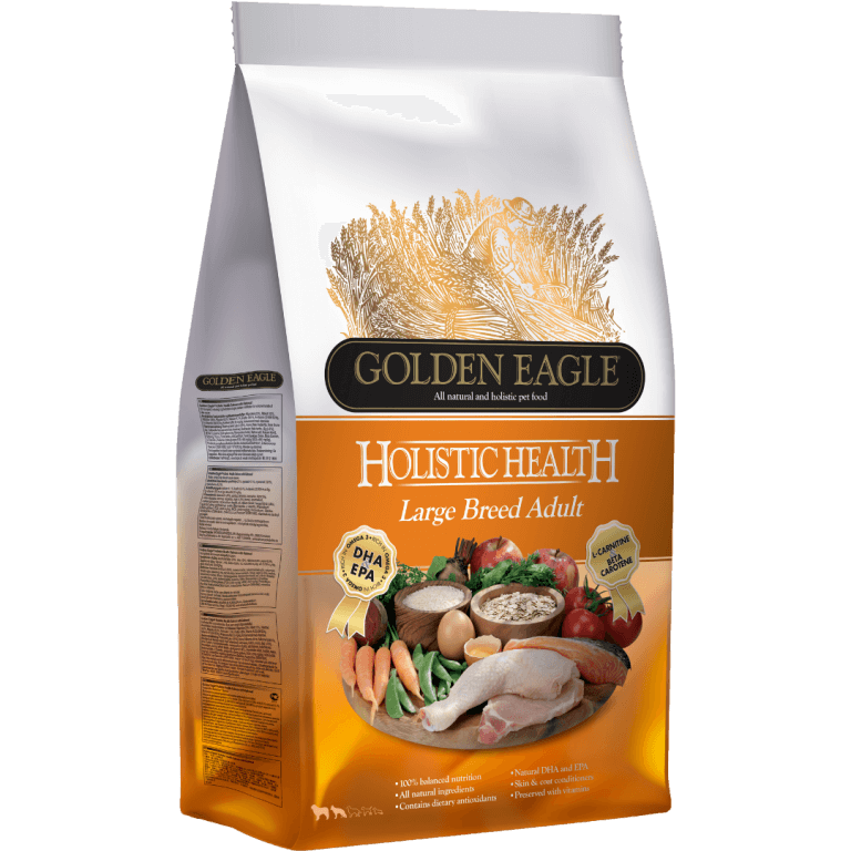 Golden Eagle Holistic Health® Large Breed Adult on suuri- ja jättiläisrotuisten aikuisten koirien luonnollinen ja holistinen täysravinto joka sisältää valikoituja, korkealaatuisia proteiinien ja hiilihydraattien lähteitä sekä terveellisiä kasviksia ja hedelmiä – ilman kemiallisia säilöntä-, maku- tai väriaineita.