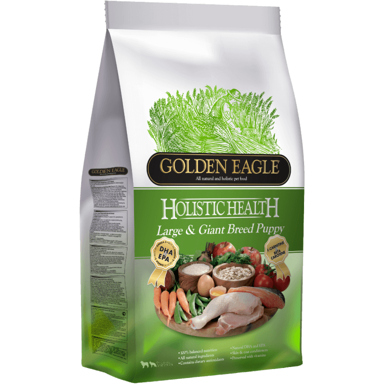 Golden Eagle Holistic Health® Large & Giant Breed Puppy on luonnollinen ja holistinen täysravinto nopeasti kasvaville suuri- ja jättirotuisten koirien pennuille. Ruoka sisältää valikoituja, korkealaatuisia proteiinien ja hiilihydraattien lähteitä sekä terveellisiä kasviksia ja hedelmiä – ilman kemiallisia säilöntä-, maku- tai väriaineita.