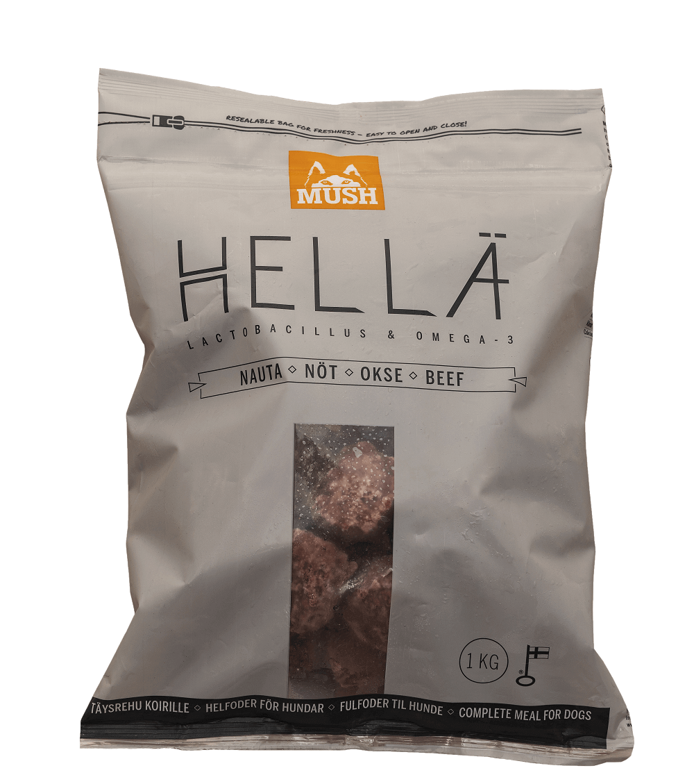 Mush Hellä Nauta on korkean proteiinipitoisuuden funktionaalinen raaka superruoka ja täysravinto. Hapatetut kasvikset sisältävät runsaan kirjon suoliston hyvinvoinnille tärkeitä maitohappobakteereita ja laadukas omega-3 kala-oliiviöljyseos tukee koiran kognitiivisia toimintoja, sekä turkin, ihon ja sydämen hyvinvointia. Lisäksi tuotteessa on huolella yrteistä koostettu vitamiini- ja hivenaine-esiseos, joka tukee koiran kokonaisvaltaista hyvinvointia.