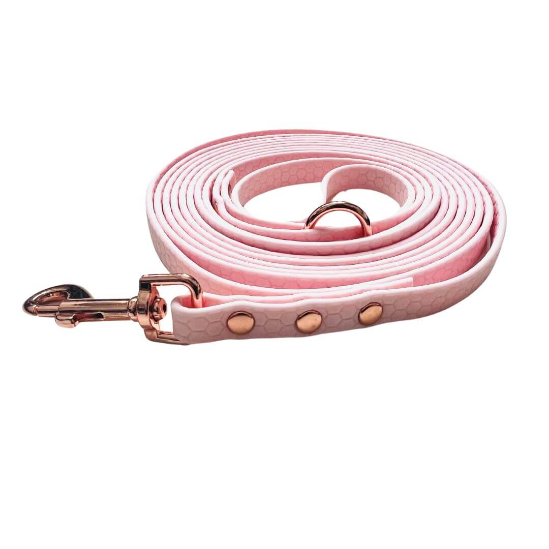 Nauhan leveys 10 mm, taluttimen pituus valittavissa n. 200 tai 300 cm. Taluttimessa on erittäin pieni ruusukultainen pistoolilukko. Hexa-hihnan käsilenkissä on lukon ja niittien kanssa samansävyinen metallilenkki.