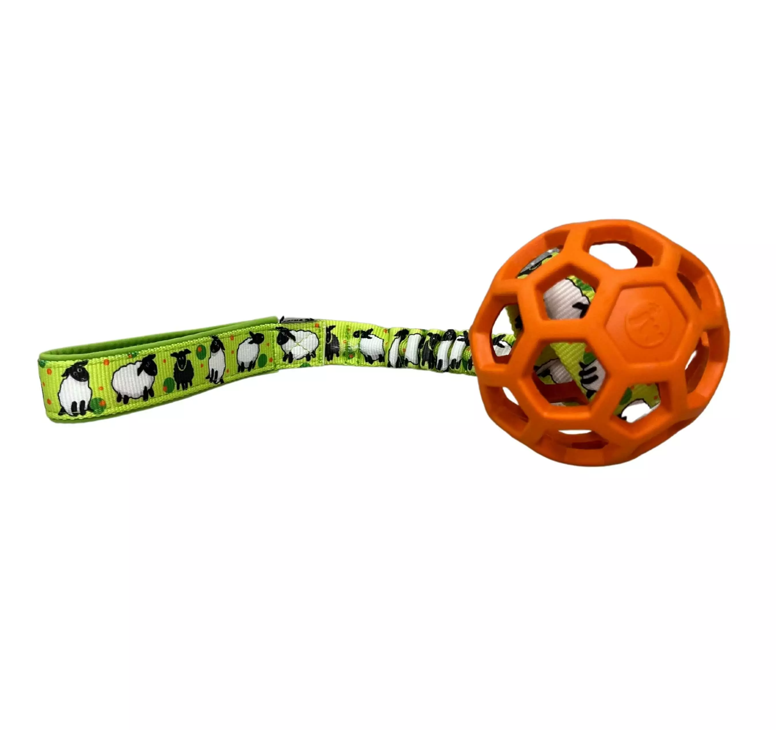 Zayma Hol-ee Roller Sheep on hauska lammaskuosinen treenilelu, jonka joustavassa varressa on koirien kestosuosikki JW verkkopallo.