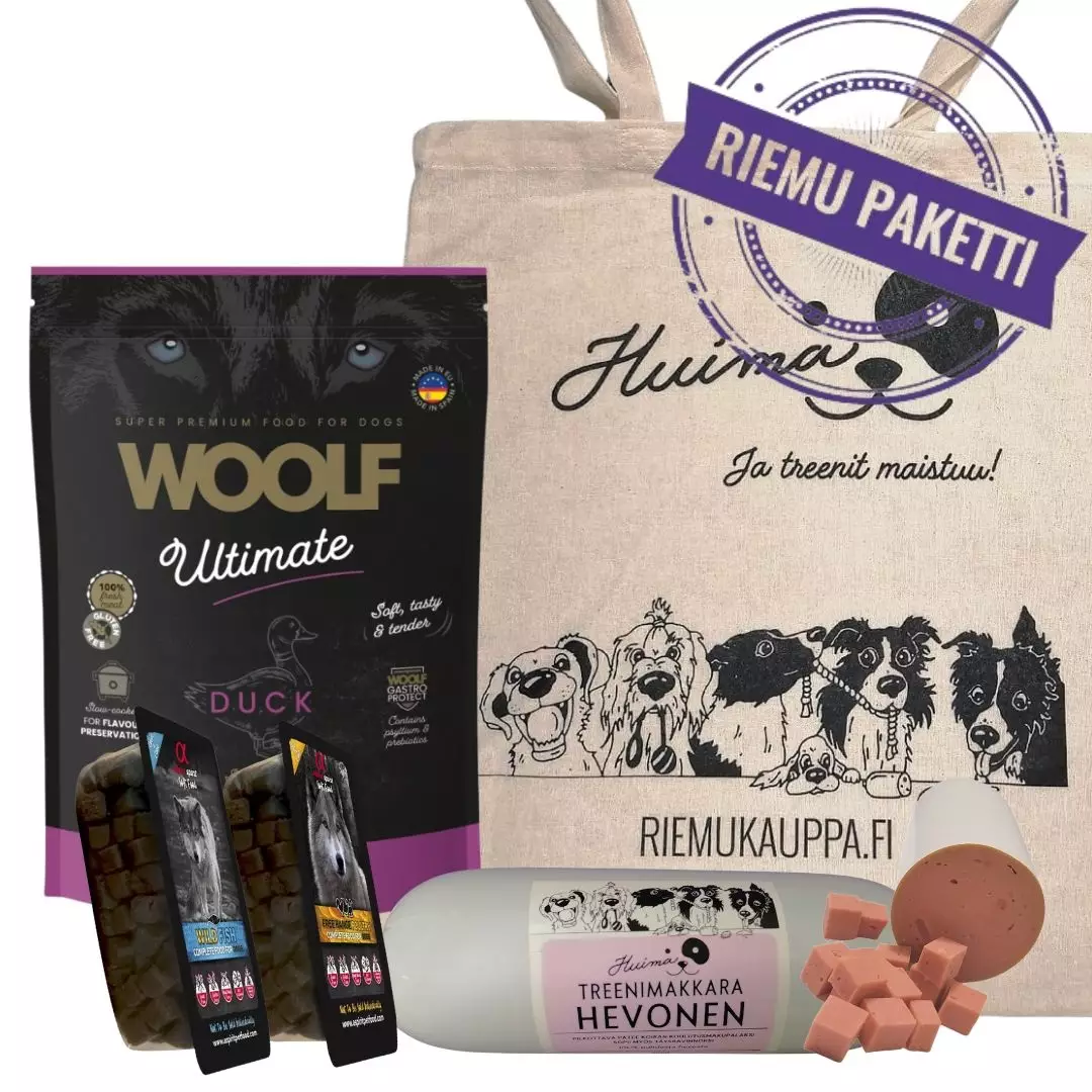 Herkkupaketti sisältää kolme erilaista puolikosteaa makupalaa sekä kaksi eri makuista, pilkottavaa treenimakkaraa pakattuna Huiman hienoon kangaskassiin. Paketissa on yli kaksi kiloa viljattomia ja erityisen maittavia herkkuruokia nautittavaksi!