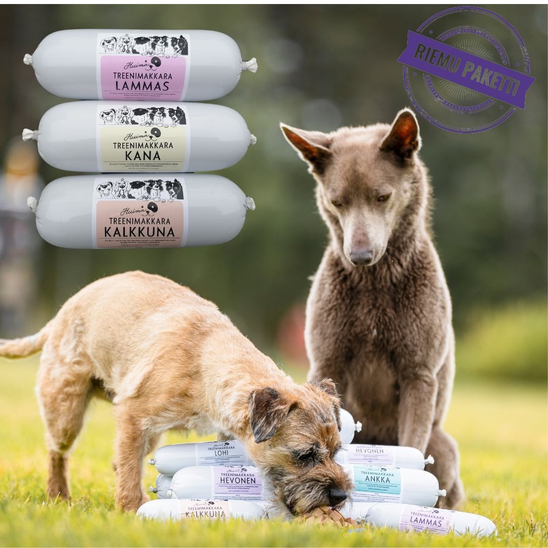 Tehosta treenejäsi ja hemmottele koiraasi Riemukaupan Huimilla treenimakkaroilla! Tämä erikoispaketti sisältää kolme herkullista klassikko makuvaihtoehtoa – kalkkuna-, lammas- ja kana-palkkamakkarat 400 g pakkauksissa.