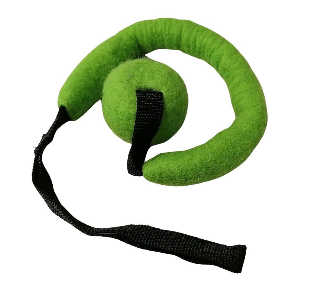Pehmoinen ja aidosta villasta valmistettu treenilelu innostaa koiran vauhdikkaisiin vetoleikkeihin. Aito villa on koirasta todella kiinnostavaa. Vetolelun varressa on huovutettu tarttuma-alue ja myös pulleasta pallosta saa hyvän otteen. Villa tuntuu miellyttävältä koiran suussa ja pitkä varsi säästää leikittäjän sormia osumilta. Villainen pallo ei pompi ja on turvallisempi heitettäväksi palkaksi kuin pomppaavat pallot. Kahvan avulla pallo on helppo heittää pitkälle. Pallo ja varsi kestävät hyvin puremista, mutta eivät kestä nyhtämistä. Huovutettua palloa voi myös korjata.