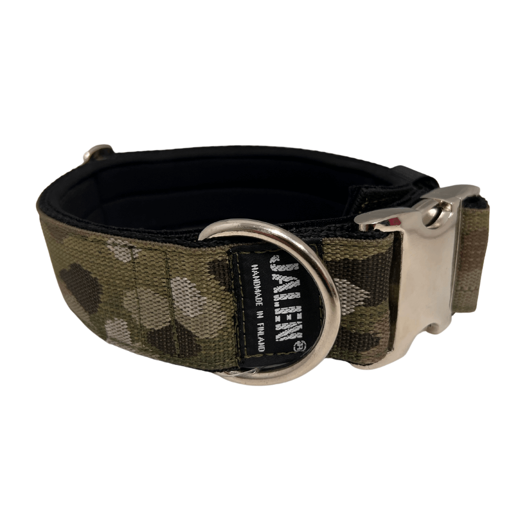 Erittäin tukeva pistolukollinen, säädettävä koiran kaulapanta. Kotimaista käsityötä! Pannan sisäpuolella on pehmeä neonpreenivuori. Väri Multicam.