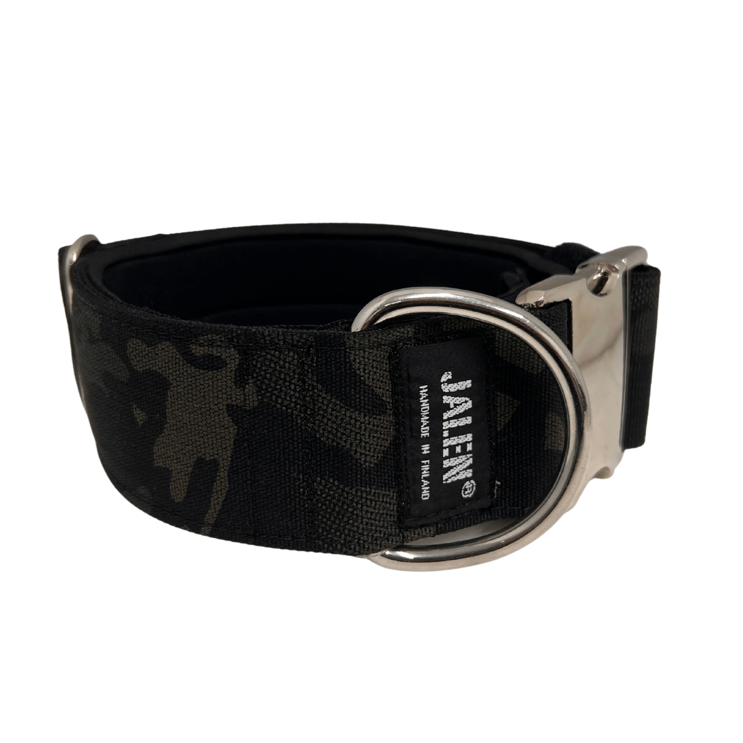 Erittäin tukeva pistolukollinen, säädettävä koiran kaulapanta. Kotimaista käsityötä! Pannan sisäpuolella on pehmeä neonpreenivuori. Väri Multicam Black.