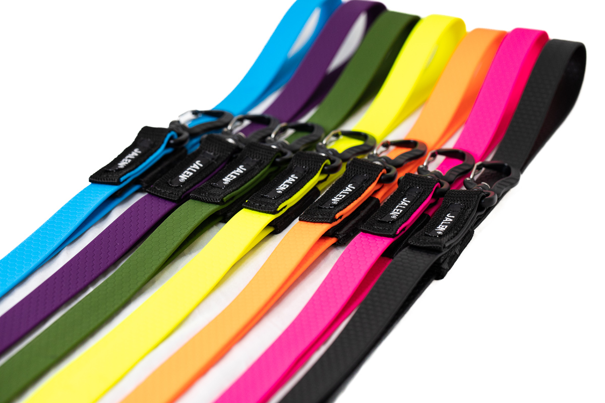 BioThaneen verrattuna Hexa-materiaali on hieman kevyempi, "lötkömpi" ja kumisemman tuntuinen. Jalen Hexa-talutin alumiinilukolla ei sovi suuremmille koirille tai koirille, jotka kieppuvat paljon hihnassa. Painaville, vetäville ja yleisesti hieman tuhmemmille koirille suosittelemme BioThane taluttimia.