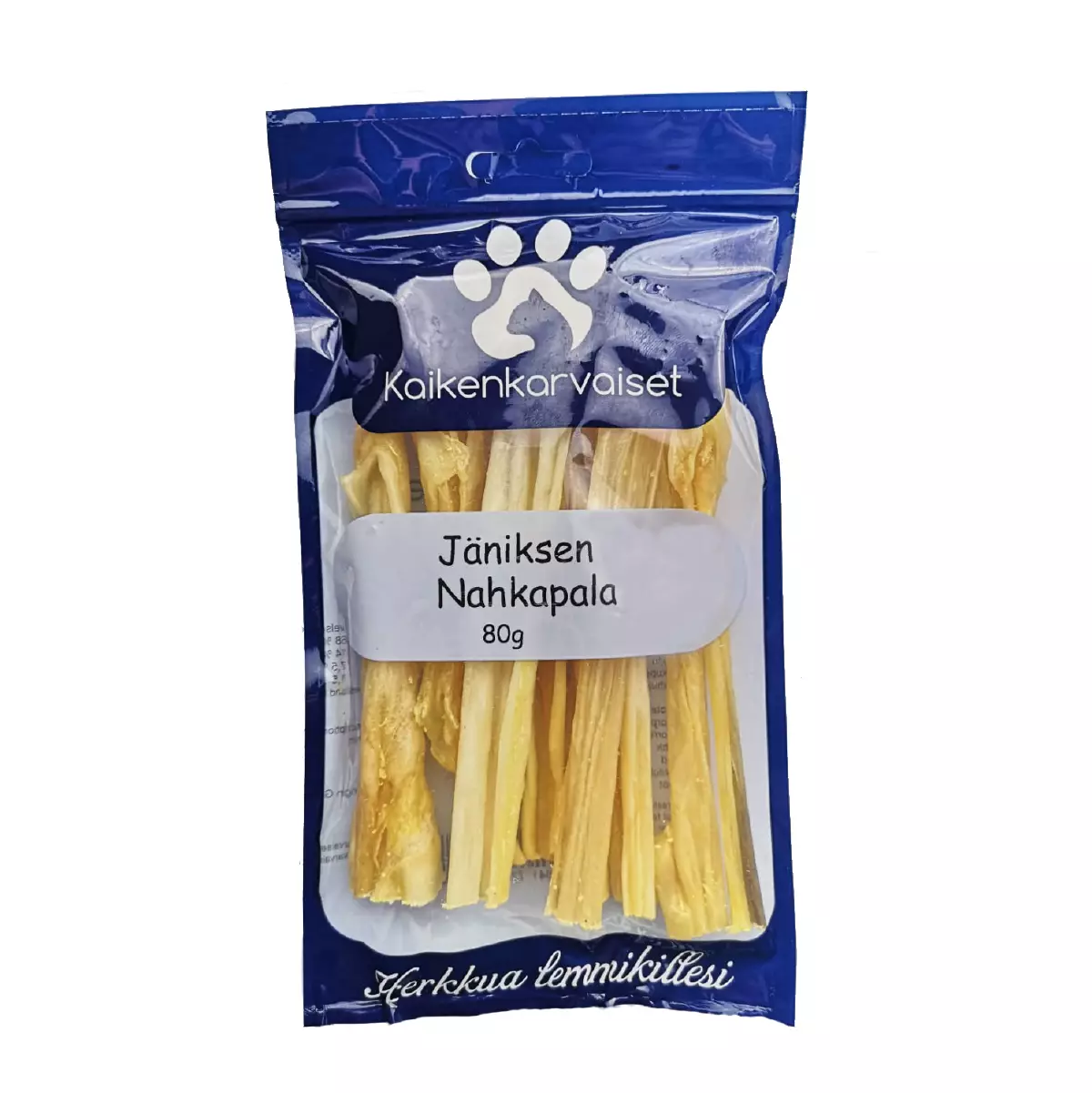 Jäniksen nahkapala on herkullinen pureskeltava herkku ja ihanteellinen vaihtoehto niille koirille, joilla on ruoka-aineyliherkkyyksiä. Hellävarainen ja helposti sulava jänis tarjoaa mukavaa vaihtelua koiraherkkujen makumaailmaan edistäen hampaiden hyvinvointia. Tuote on 100 % luonnollinen eikä sisällä lisä-, säilytys- tai makuaineita - vain puhdasta, ehtaa eläinperäistä herkkua.