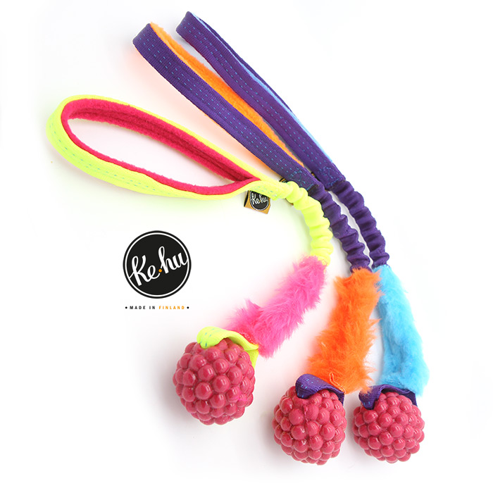 Ke-hu Vadelma -vetolelu on pikkukoirien lelu, jossa puruotteessa joustava ontto vadelman muotoinen pieni pallo. Lelun kiinnostavuutta lisää tekoturkiskaistale. Kahvasta löytyy joustoa ja käsilenkistä miellyttävän pehmeä fleecevuori. Kahva on kapeampi kuin isommille koirille suunnatuissa Ke-hu leluissa. Ke-hu Vadelma -palkkalelussa on Amerikassa valmistettu Planet Dogin laadukas ja kestävä pallo. Koiran suuhun mukavan tuntuinen nystyräinen pallo on sisältä ontto. Ke-hu Vadelma treenilelu kestää hyvin myös keskikoisilla koirlla, mutta huomioi että isommilla koirilla lelu mahtuu hyvin takahampaiden väliin eikä välttämättä kestä niin suurta puruvoimaa.