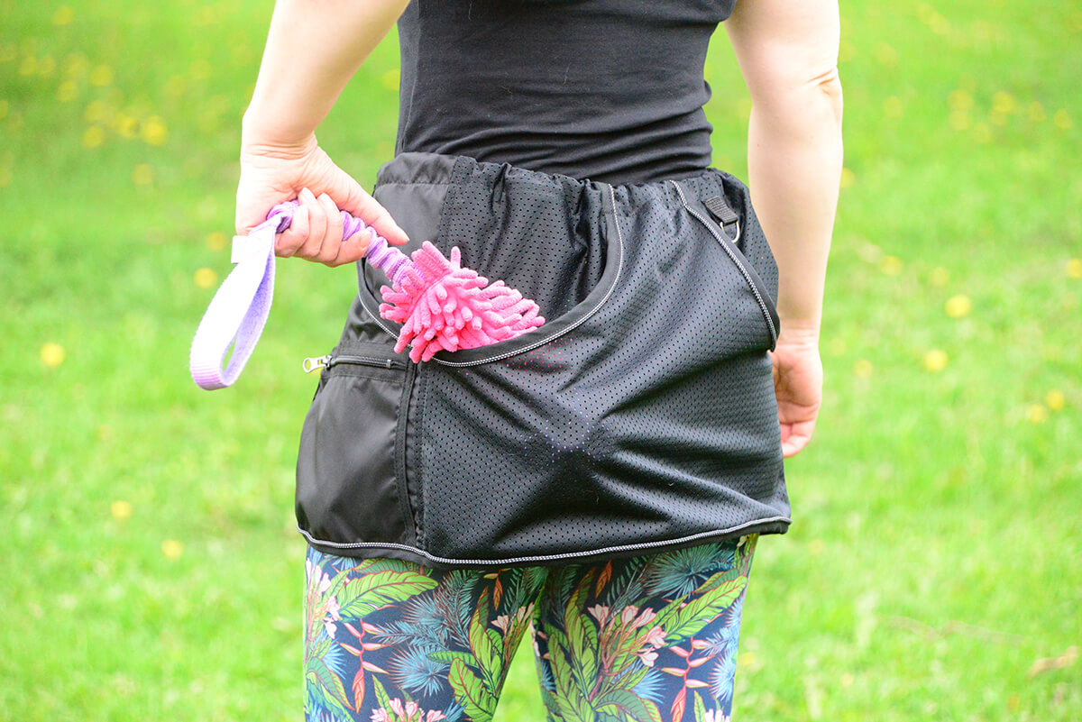 Takapuolelta löytyvä tilava yhtenäinen tasku mahdollistaa isompienkin motivointilelujen mukanakuljetuksen. Treenitaskusta löytyy myös kaksi pienempää vetoketjullista taskua esim. puhelimelle ja avaimille. Etureunan pyöreä leikkaus lisää käyttömukavuutta vauhdikkaassa menossa. Numerolappua varten treenitaskusta löytyy pidike klipsillä ja takaa löytyy lenkki mihin saa esim. taluttimen kiinni.