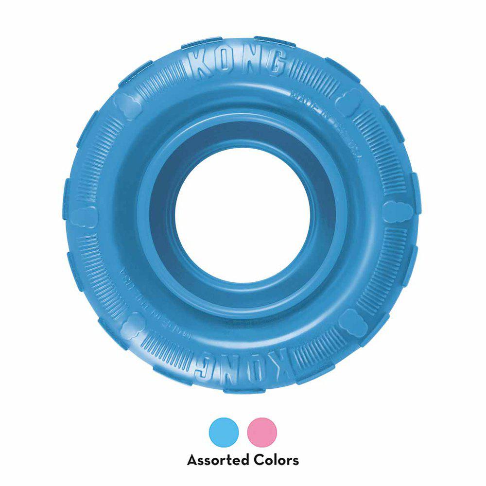 Kong Puppy Tire koiran aktivointilelu on kestävä, ruoalla ja herkuilla täytettävä lelu pennuille ja pehmeäsuisille koirille.