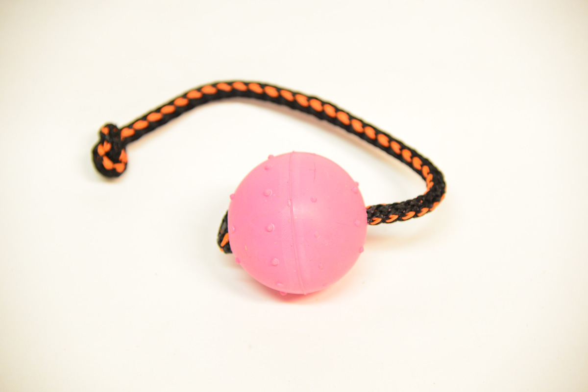 Täyskuminen ja kestävä palkkapallo harrastekoirille. Nystyröillä varustetussa kumipallossa on suora, n. 25 cm pitkä naru. Pallon halkaisija 60 mm. Pallo on materiaaliltaan kestävä ja tuntuu koiran suussa miellyttävältä. Narun avulla saalisleikkiin saa mukaan mukavan vetoleikin. Narun avulla pallon saa lentämään kauemmas ja pallon perään juokseminen on koirasta hauskaa.