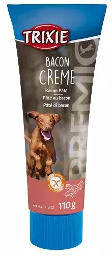 Trixie pekoninmakuinen herkkutahna tuubissa sopii niin palkkaukseen kuin aktivointilelujen täytteeksi.