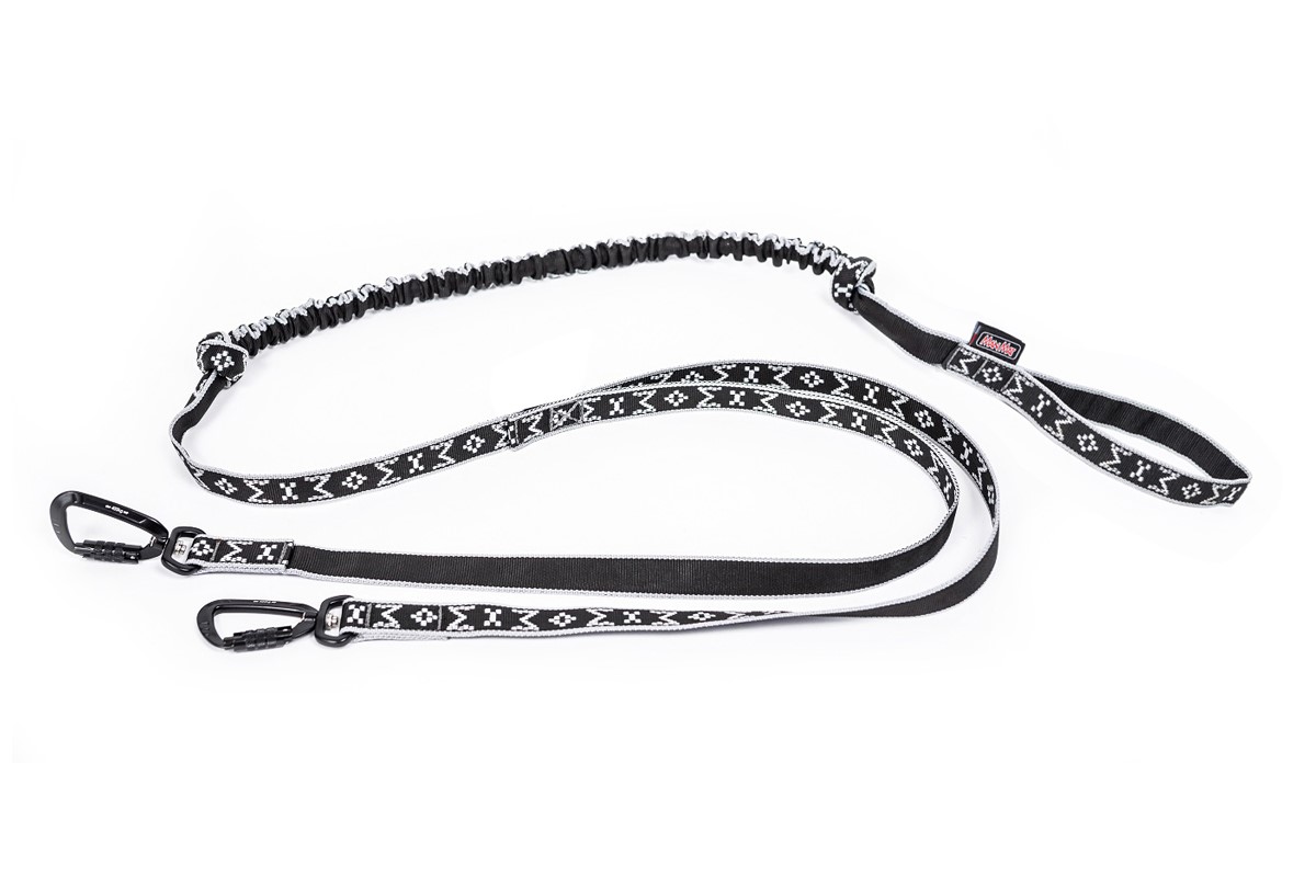 Manmat Bungee Line joustava vetoliina kahdelle koiralle. Erinomainen valinta kahden koiran kanssa hiihtoon, pyöräilyyn, canicrossiin eli koirajuoksuun, kickspark- ja kickbike-harrastuksiin sekä kävelyyn ja retkeilyyn.