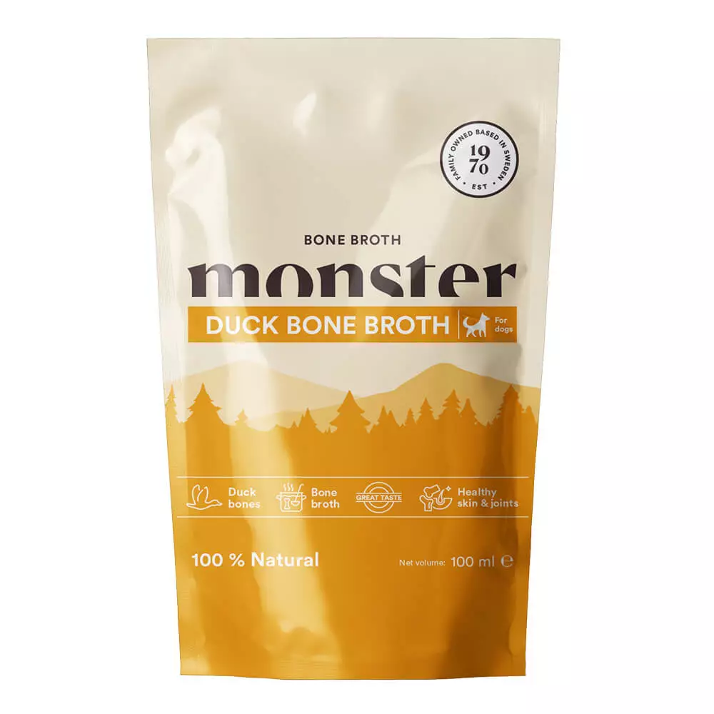 Monster Dog Bone Broth Duck luuliemi ankanluista on täydellinen tapa pitää yllä koirasi nestetasapainoa. Lisäksi se sisältää kollageenia, joka tukee niveliä, jänteitä, ihoa ja turkkia.