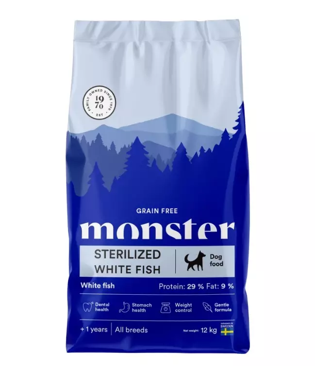 Ruoan optimoitu proteiini- ja rasvapitoisuus auttaa ylläpitämään terveellistä painoa, ja lisätty L-karnitiini muuntaa rasvaa käyttökelpoiseksi energiaksi. Valkoinen kala ainoana proteiininlähteenä vähentää allergiariskiä ja on luonnostaan rikas omega-3-rasvahapoista, jotka edistävät ihon ja turkin terveyttä. Monster Grain Free Sterilized White Fish on hyvin maistuva kuivaruoka,joka tukee koiran hyvinvointia kokonaisvaltaisesti.