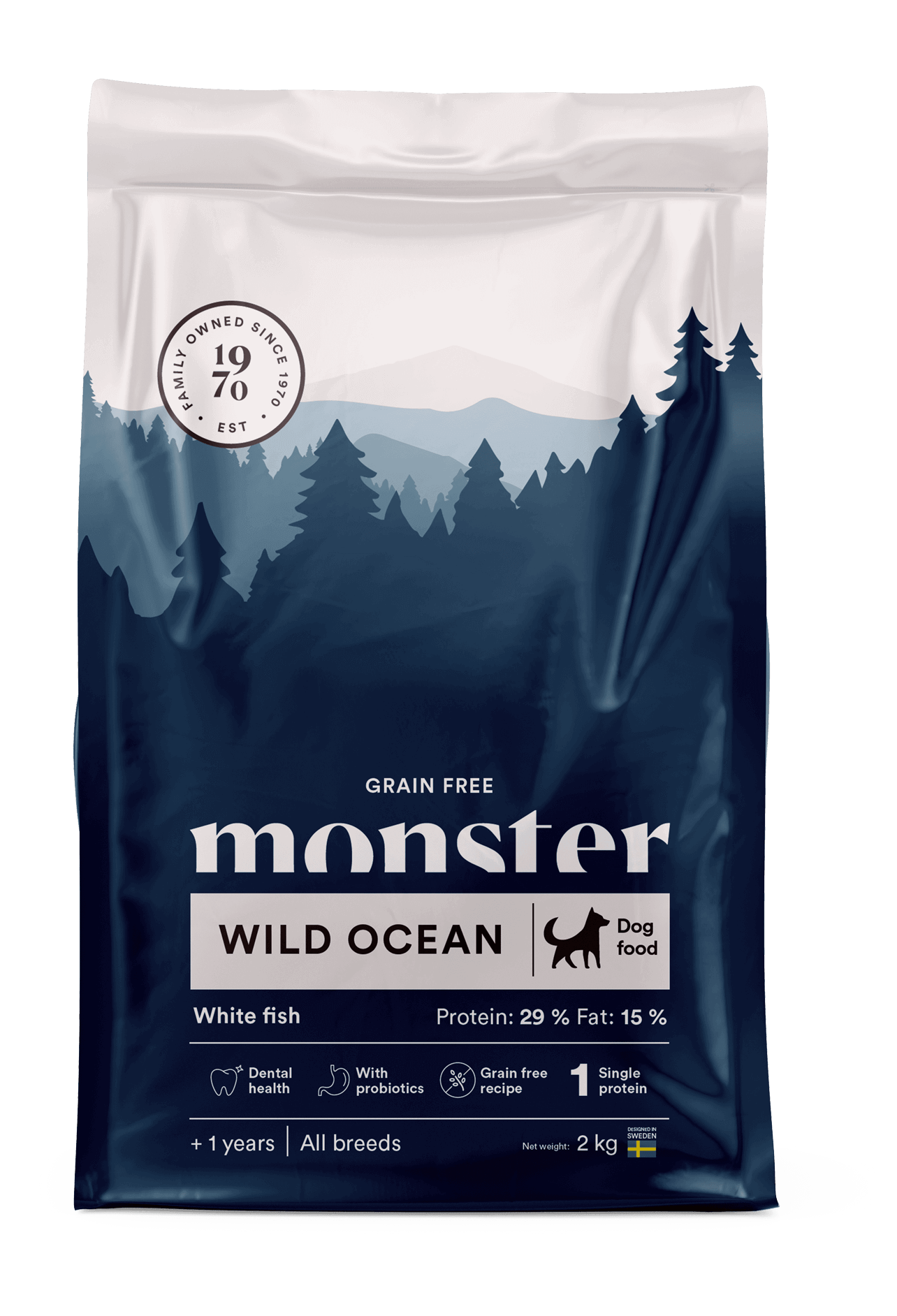 Monster Grainfree Wild Ocean ei sisällä turhia täyteaineita vaan puhtaita ja luonnollisia raaka-aineita. Proteiinilähteenä toimivat kalat on pyydetty vastuullisesti. Täysravinto sisältää myös vitamiineja ja kivennäisaineita, jotka tukevat koiran terveyttä pitkällä aikavälillä.