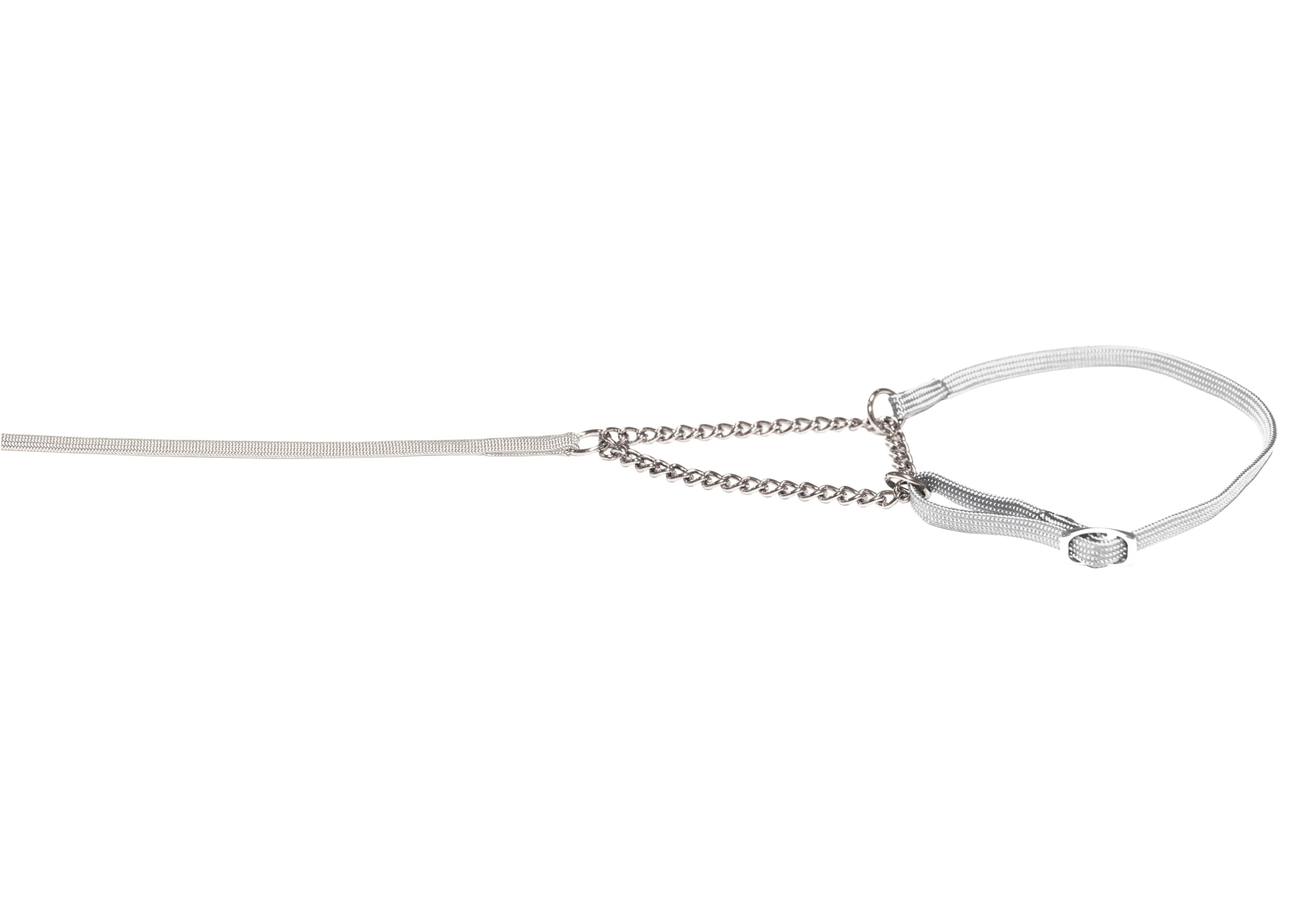 Näyttelytaluttimessa on ketjullinen puolikiristävä panta, joka on säädettävissä. Puolikiristävän pannan sisältävä näyttelytalutin sopii erityisesti koirille, joilla on tapana vetää pää pannasta läpi. Suosittelemme tätä näyttelytalutinta pienille ja keskikokoisille koirille. Taluttimen koko pituus on 140 cm ja paksuus noin 7 mm.