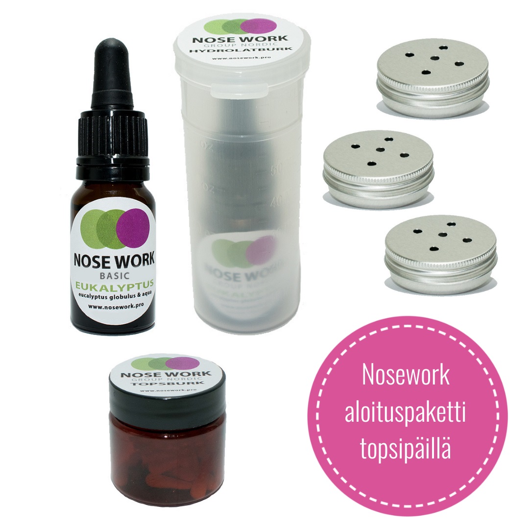 Noseworkin ensimmäisessä luokassa etsittävä haju on eukalyptus. Noseworkissa käytettävät hajut ovat hydrolaatteja, jotka on pakattu pipetilliseen lasipulloon. Koska pullot eivät ole täysin tiiviitä hajun suhteen, on hydrolaattia hyvä säilyttää erillisessä suljettavassa säilytyrasiassa. Hydrolaattia tiputetaan topsipäähän, joka laitetaan rasiaan. Rasian kannen saa kiinni hyvin, eikä se aukea kesken treenin. Kolmella purkilla voit helposti tehdä useamman etsinnän peräkkäin. Purkkien magneetti on voimakas neodyymimagneetti ja purkki pysyy hyvin kiinni metallisissa kohteissa –voit siis helposti tehdä pienen harjuerotteuradan vaikka jääkaapin oveen!