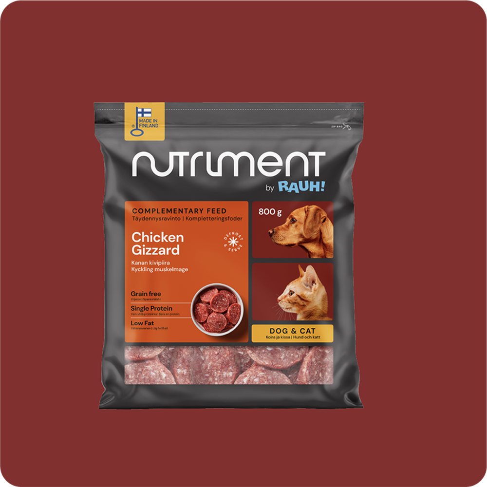 Nutriment by RAUH raakapakasteet on puhtaista raaka-aineista valmistettua raakaruokaa ilman säilöntäaineita. Kanan kivipiira eli toiselta nimeltään kanan lihasmaha sopii kätevästi täydennysravinnoksi muun raakaruuan seassa tai kuivaruuan lisänä. Kivipiira on erityisen herkullinen osa kanaa, joka maistuu sekä koiralle että kissalle. Sulata, tarjoile ja anna lemmikkisi nauttia! Sisältää vain yhtä proteiinin lähdettä. Alhainen rasvapitoisuus. Sopii keventäjille erinomaisesti!