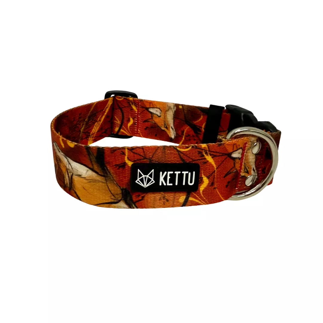 Kettu pikalukollinen ja säädettävä nylonpanta tyylikkäällä Tulikettu-kuosilla. Ihastuttavat ja persoonalliset Kettu koiran kaulapannat ovat tyylikäs valinta jokaiselle koiralle!