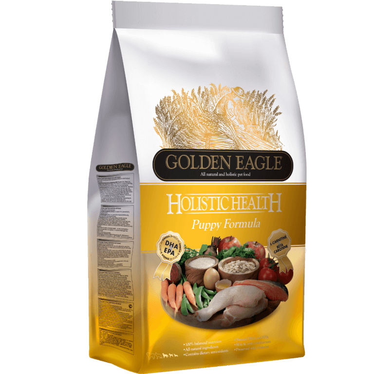 Golden Eagle Holistic Puppy on kantavien narttujen sekä pentujen luonnollinen ja holistinen kuivaruoka, joka sisältää valikoituja, korkealaatuisia proteiinien ja hiilihydraattien lähteitä sekä terveellisiä kasviksia ja hedelmiä – ilman kemiallisia säilöntä-, maku- tai väriaineita. Ei sisällä vehnää, soijaa eikä maissia.