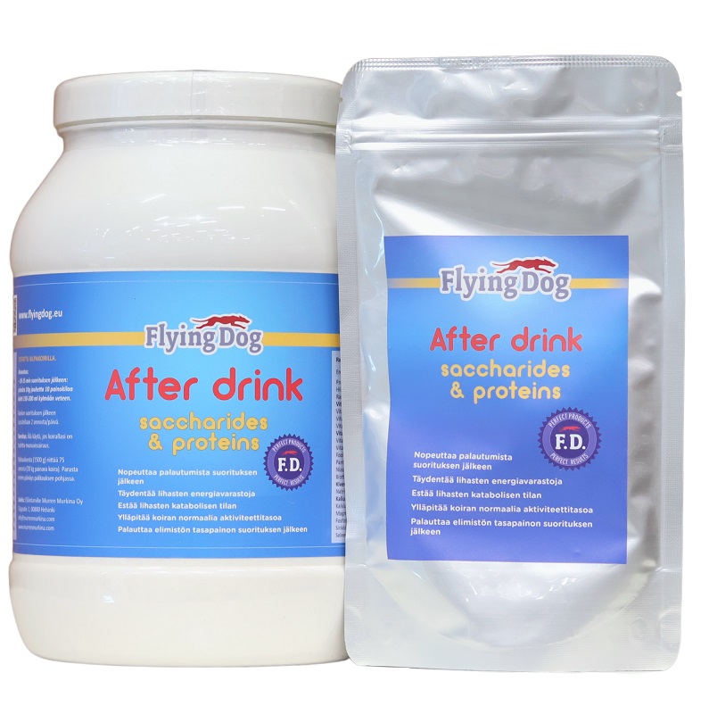 Flying Dog After Drink palautusjuoma nopeuttaa koirasi palautumista suorituksen jälkeen. Juomajauhe sisältää aminohappoja, B6-vitamiinia ja kaliumia, jotka täydentävät lihasten ja maksan glykogeenivarastoja. Tämä estää lihasten kataboliaa ja nopeuttaa palautumista.