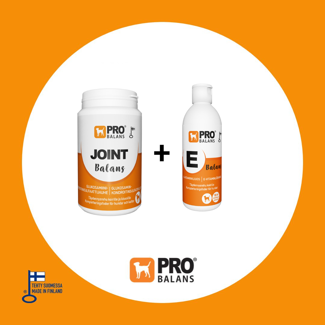 Jointbalansin sisältämät glukosamiini ja kondroitiinisulfaatti ovat nivelruston rakennusaineita, jotka ylläpitävät aktiivisen harrastuskoiran nivelterveyttä sekä tukevat jo iäkkäämmän koiran liikkuvuutta. E-vitamiini on antioksidantti, joka suojaa soluja hapettumisen aiheuttamilta vaurioilta. E-vitamiinin tarve kasvaa erityisesti fyysisen rasituksen myötä, sekä ruoan rasvapitoisuuden kasvaessa.